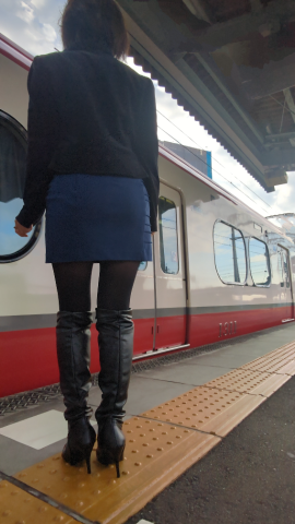 私のコーデは 青色のミニスカート ブラウス 黒のタイツ 黒のロングブーツ やっはり黒より ベージュがいいのかなぁ?