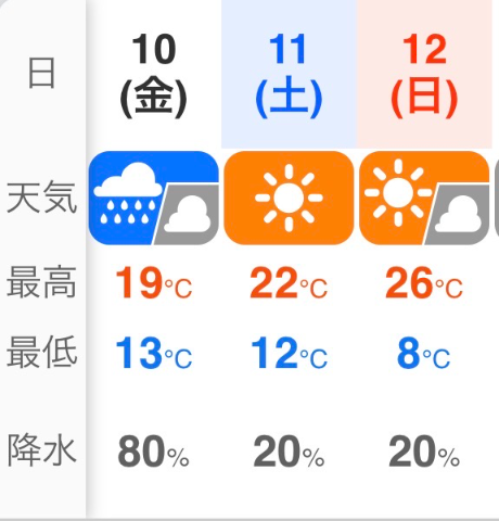 雲が広がりやすく、次第に雨。山間部では平地より気温が低くなるため注意です。
