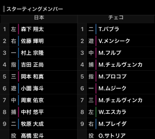 お疲れさまでしたWBC日本vsチェコ戦前に稲葉さん最高〜そっと悲しみに、こんにちはぁ〜〜〜稲葉さんのタッチ最高〜タッチ!!!かっこいいーヒューーこんな稲葉さんのLIVE観られるなんて豪華やねぇ大谷選手は、スタメン外れた。1番 森下翔太(レフト)?2番 佐藤輝明(ライト)?3番 村上宗隆(ファースト)4番 吉田正尚(指名打者)?5番 岡本和真(サード)?6番 小園 海斗(ショート)?7番 周東 佑京(センター)?8番 中村 悠平(キャッチャー)?9番 牧原 大成(セカンド)?先発 高橋宏斗チェコ戦、侍ジャパンのスタメンです??サトテル、森下、小園、牧原、周東と初のスタメンが揃いました。色々試せるのがありがたい。牧秀悟はベンチスタートです現地の方も、Netflixの方も、ラジオの方も、熱い応援をしましょう??勝つぞ侍ジャパン??只今、テレビを見ながら待機中ですまたあとで?
