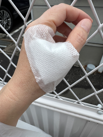お散歩がてら皮膚科に行って3日前?の夜に火傷したところを診てもらいました患部は2センチくらいなんですけどガーゼ 貼られると大袈裟な感じになります(汗)一週間もすれば治ってるのでは?ということで一週間後に また診ていただきますつきより